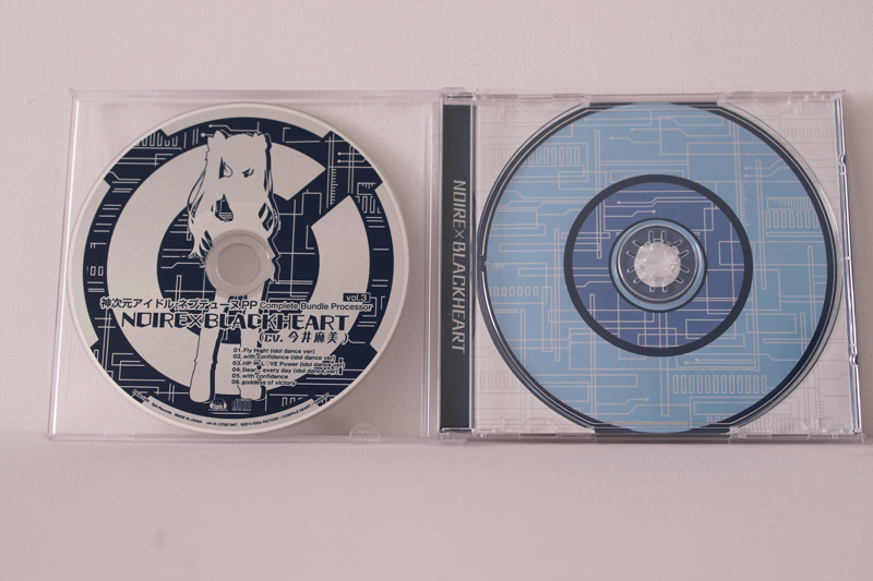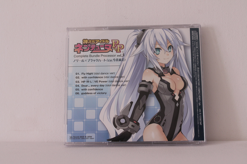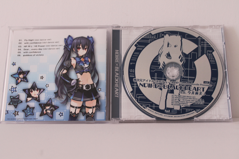![]() ![]() Idol PP Complete Bundle Processor ist die dritte Character Song CD in der Noire vertreten ist und steht den vorherigen in nichts nach. Die Songs bestehen zwar nur aus schon Existenten doch diesmal von Noire gesungen. ![]() ![]() Ein Negativpunk jedoch ist das diesmal keine Instrumentals vorhanden sind, stattdessen bestehen Track 5 und 6 aus Noire's Kamijigen Songs Goddess of Victory und with confidence in ihrer Normalen version. Tracklist: 1. Fly High (Idol dance ver) [Neptune's Imagesong] - Noire 2. with confidence (Idol Dance Ver) [Noire's Image Song] - Noire 3. HP ∞ LOVE Power (Idol Dance Ver) [Vert's Image Song] - Noire 4. Dear.... Every day (Idol Dance Ver) [Blanc's Image Song] - Noire 5. with confidence - Noire 6. Goddess of Victory - Black Heart |